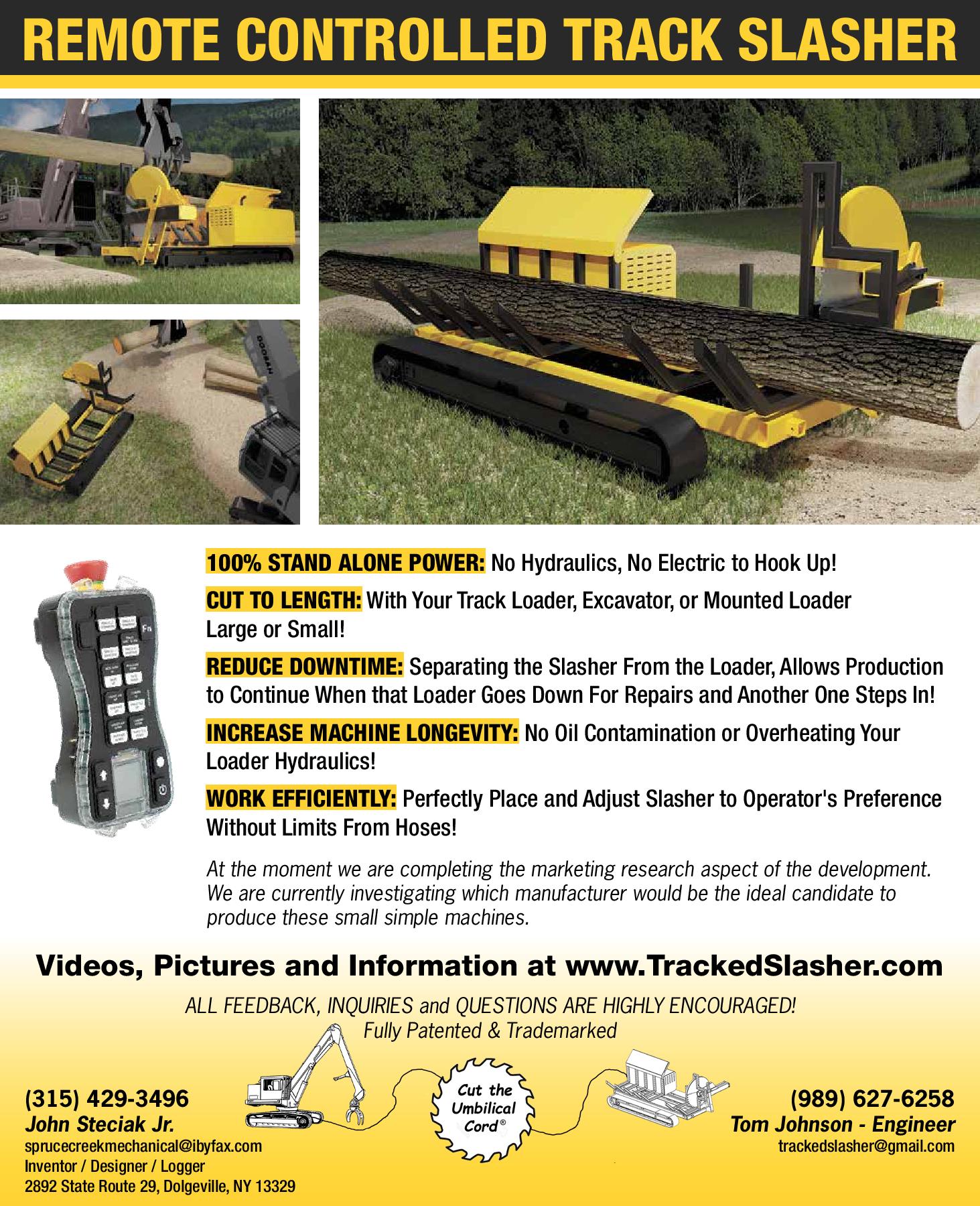 For the first time ever now an excavator with a hydraulic thumb can carefully cut timber, furthermore a rear mounted loader on a tri axle truck can drag trees on to the slasher to buck up wood crossways. Said Johnson, “This is looking way outside the box. They’ve been building slashers for so many years and no one has ever built one like this that I could find. Its innovation out of necessity.” Johnson helped Steciak refine has prototype and draft a new model of the tracked slasher. Currently, Johnson and Steciak are in what they call the “market research” phase of the project. They’re hoping to find a manufacturer who will put the tracked slasher into production, so that other loggers can have access to this easier ways of bucking up trees. “I think part of its is just finding the right company.” said Johnson - We’re looking for a company that already has dealerships and is connected to the logging business. We’re looking for a company that understands hydraulics, remotes and tracks and can help put this together.