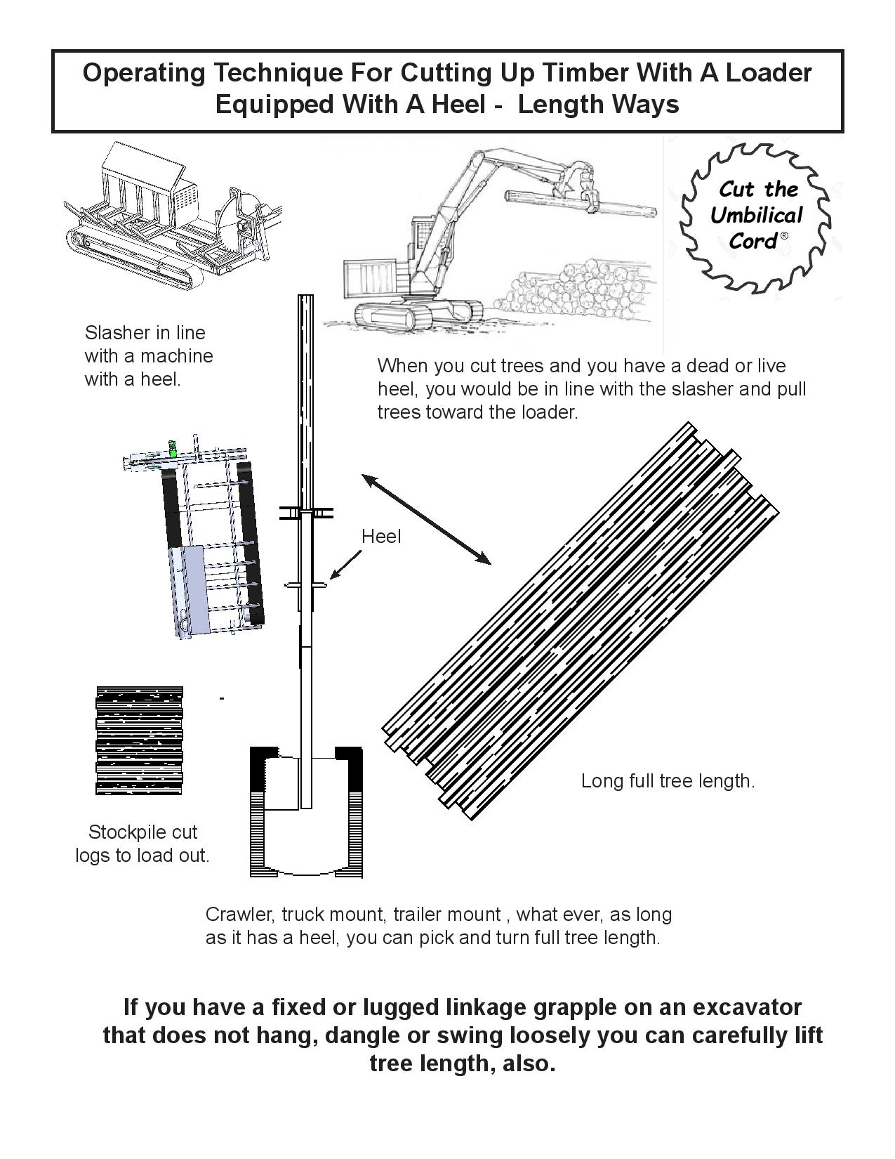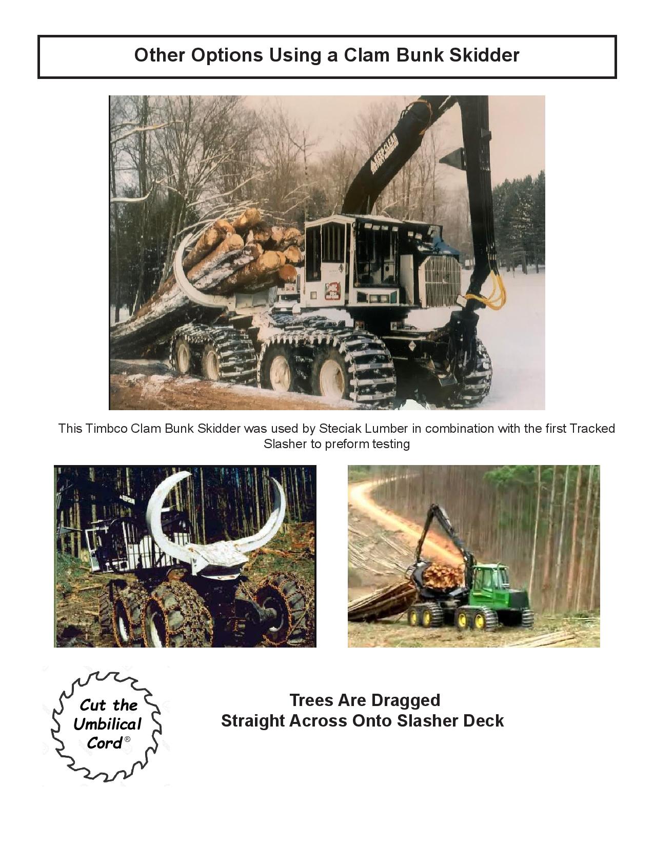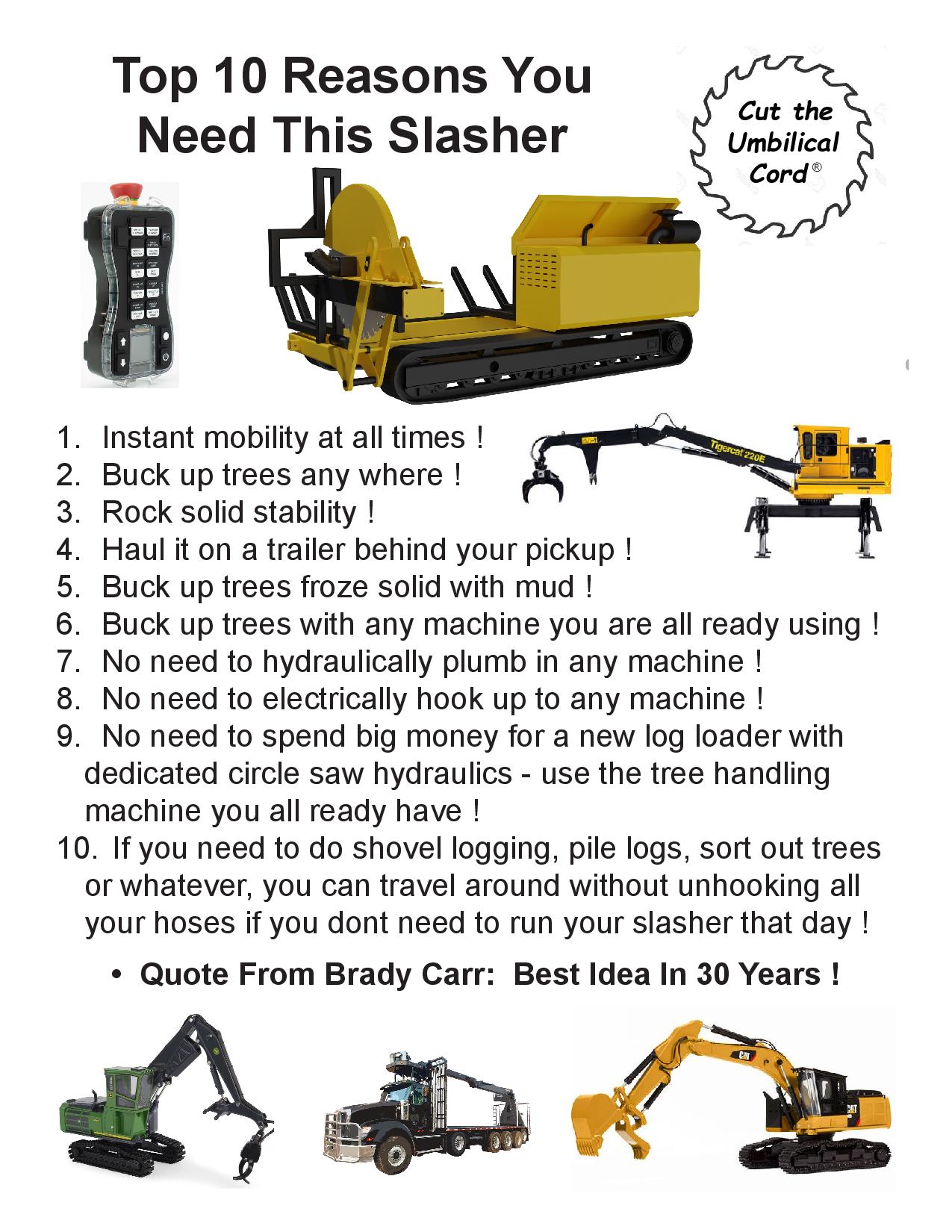 “Cut The Umbilical Cord”® with a self-powered slasher mounted on a self-propelled track carrier similar to tracked chippers and grinders. The low and long undercarriage keeps the slasher close to the ground and stable. It can be turned and adjusted at a moment’s notice to fit the ever changing scene on a modern logging job. All with no hydraulics or electrics to hook up. The radio remote control can be used in any log handling machine.