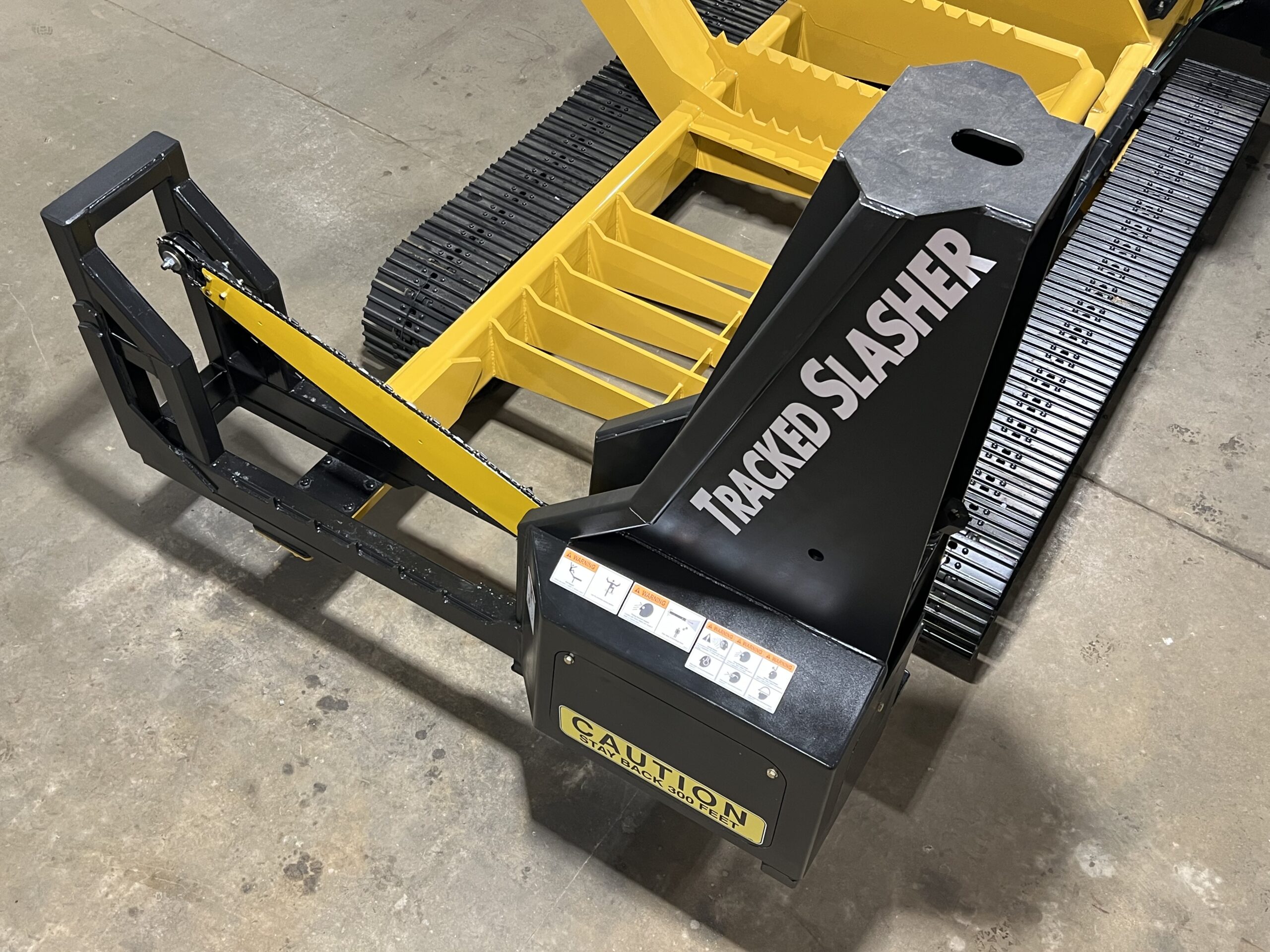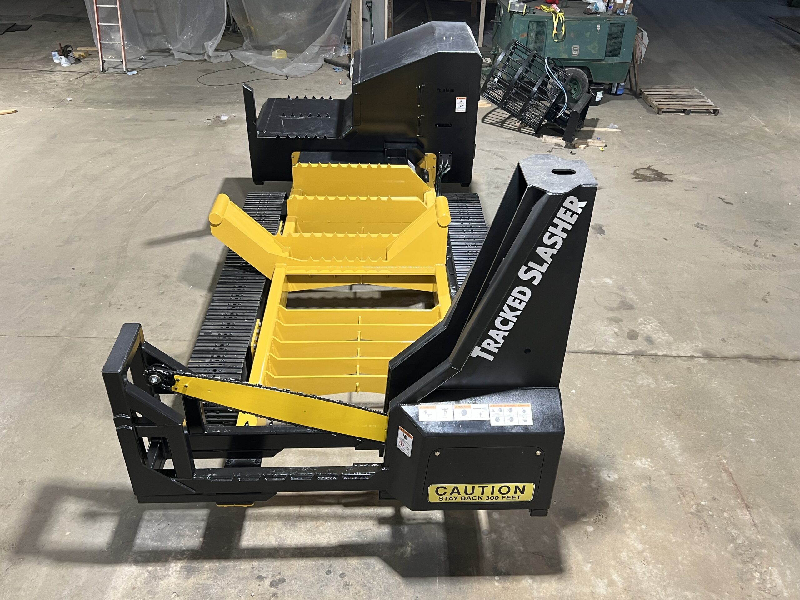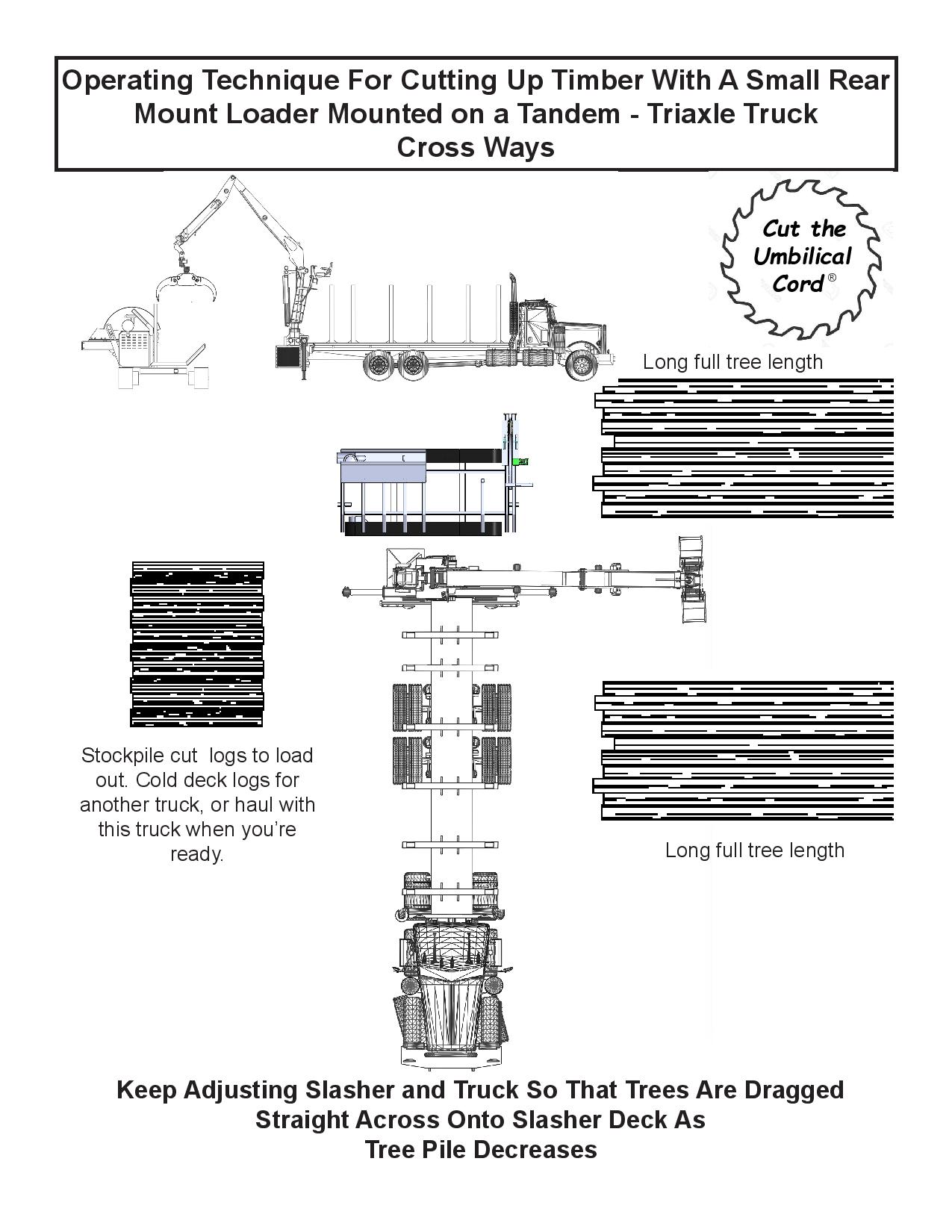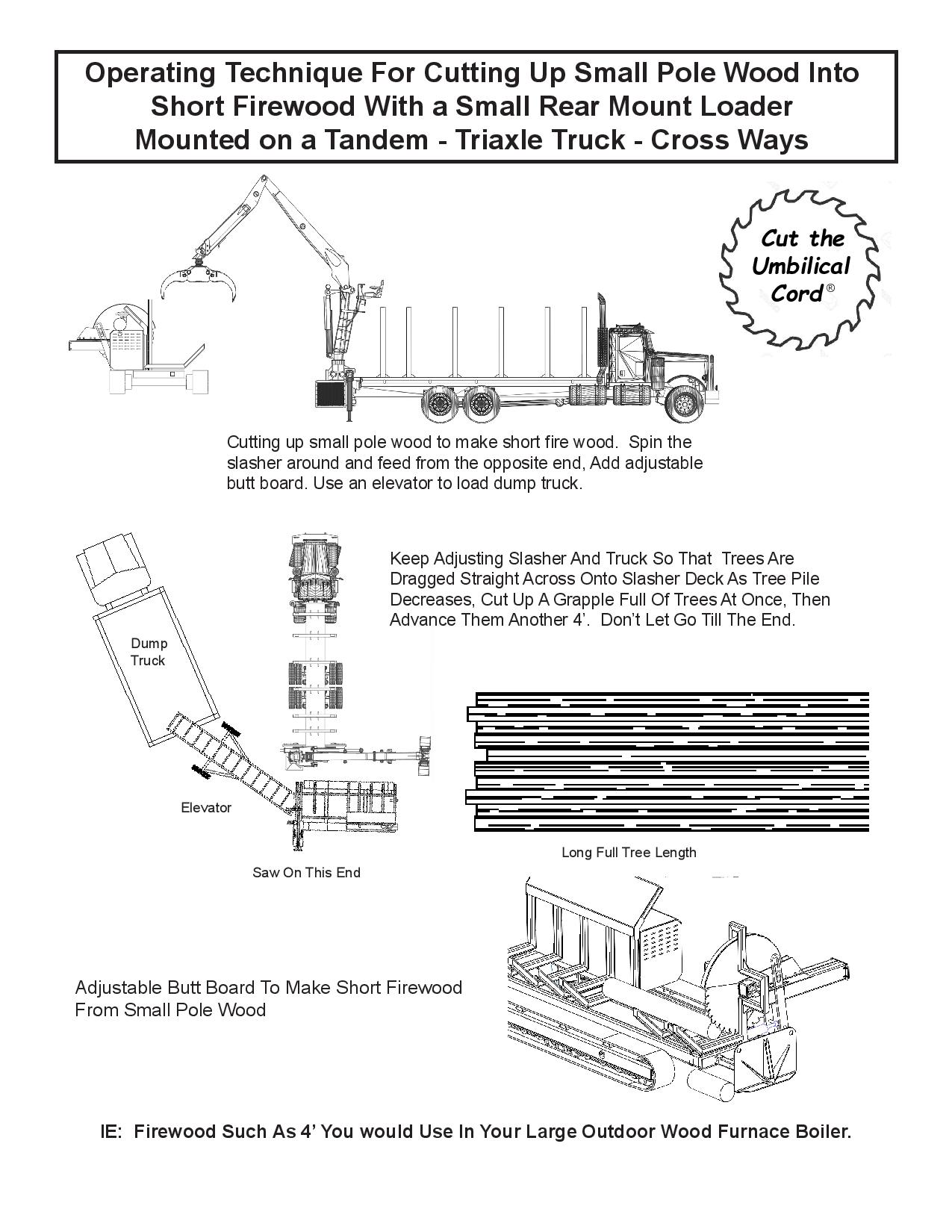 “Cut The Umbilical Cord”® with a self-powered slasher mounted on a self-propelled track carrier similar to tracked chippers and grinders. The low and long undercarriage keeps the slasher close to the ground and stable. It can be turned and adjusted at a moment’s notice to fit the ever changing scene on a modern logging job. All with no hydraulics or electrics to hook up. The radio remote control can be used in any log handling machine.