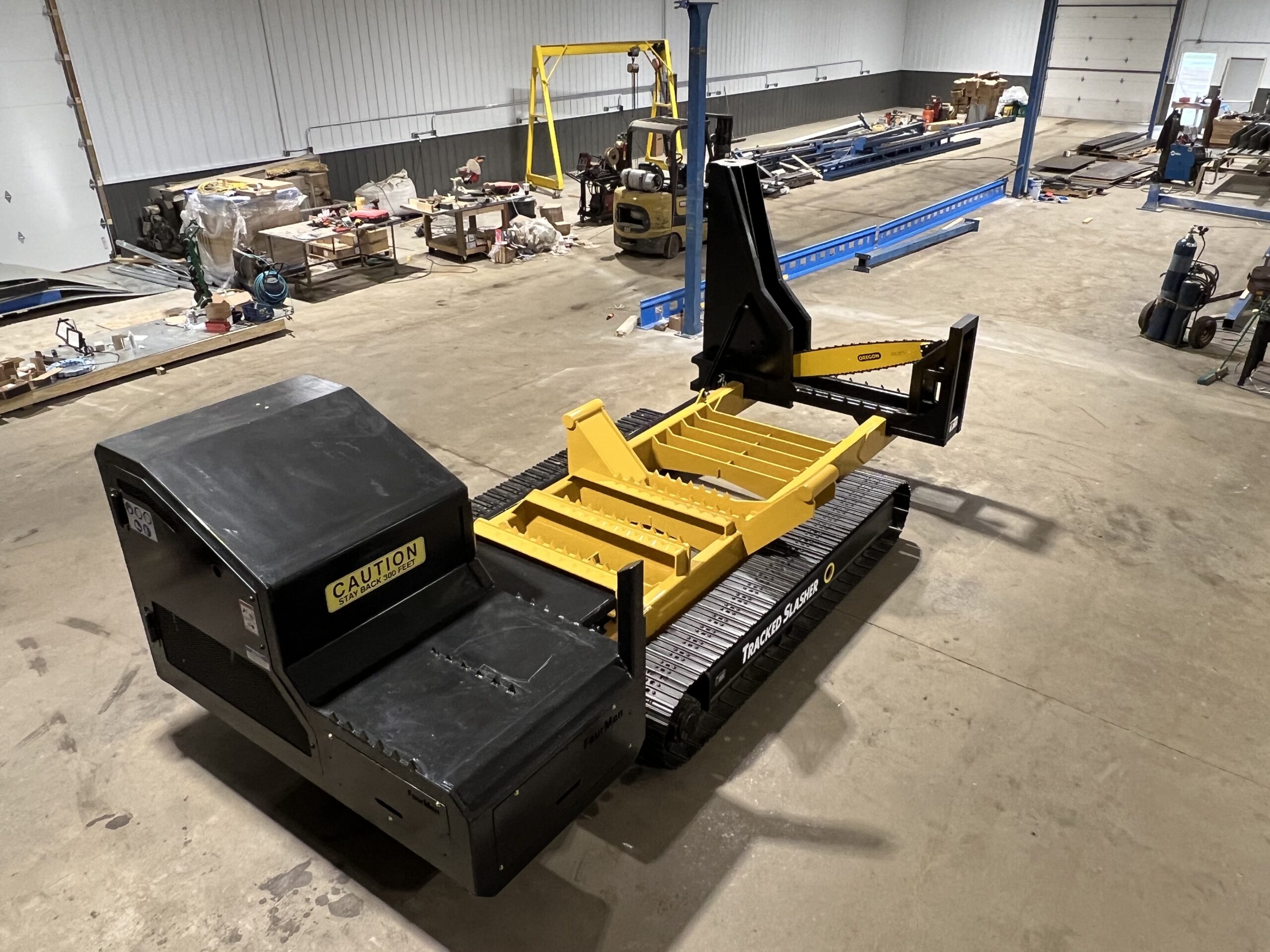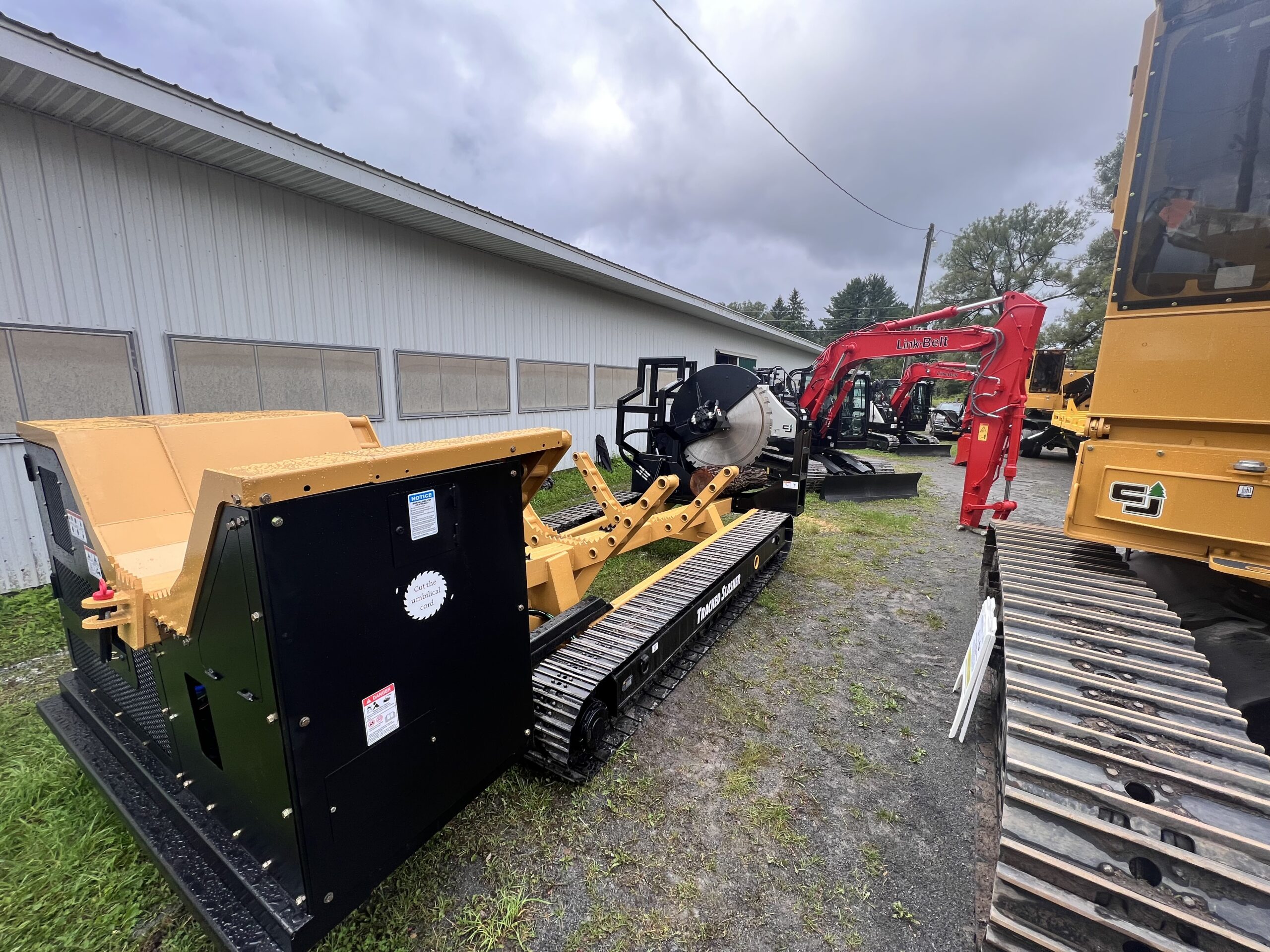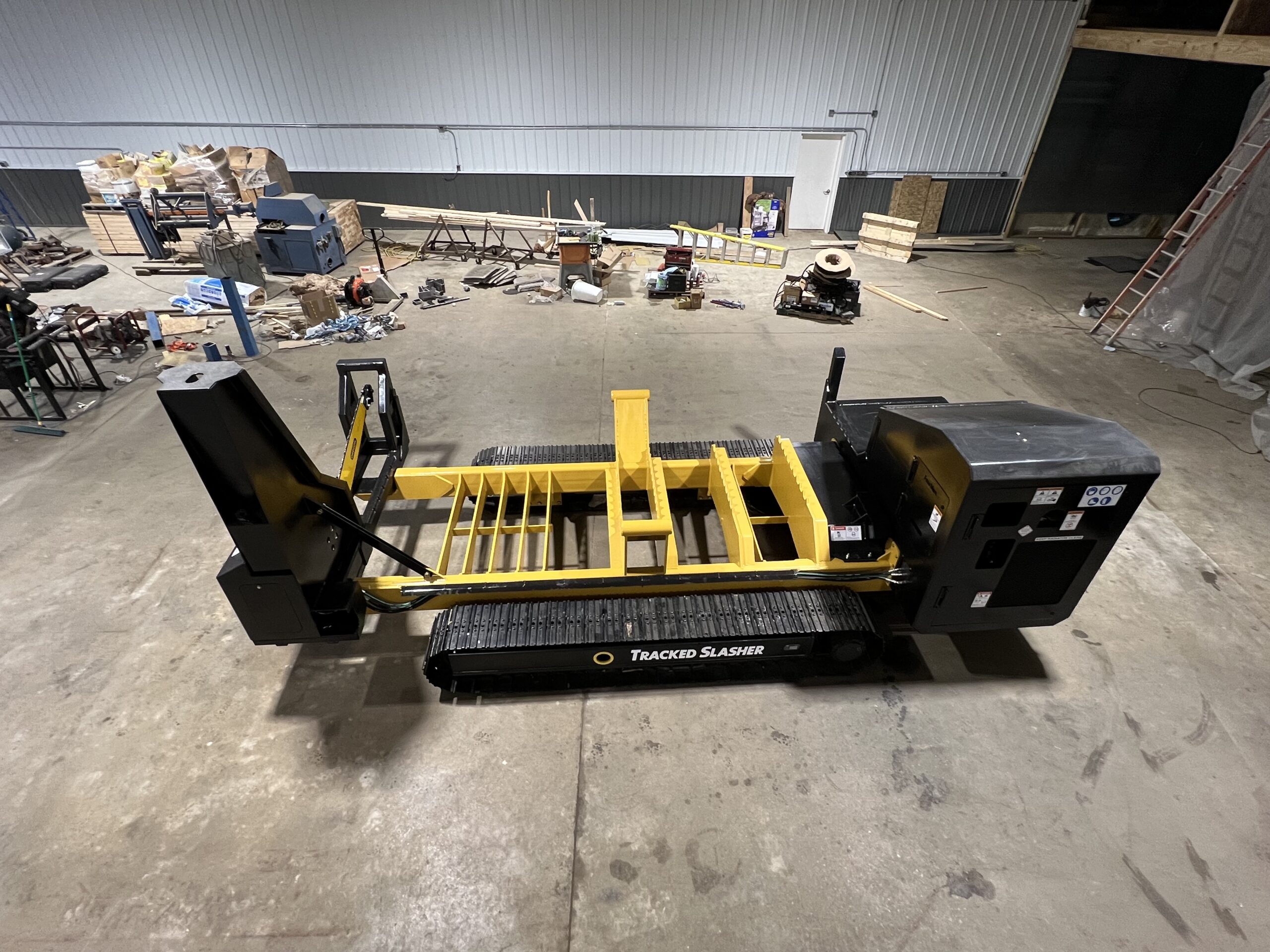 Then John’s thoughts started to get creative. Said Steciak, “I thought, a log loader’s boom geometry is great for lifting but not so good job at logging. But you can’t cut up timber with it.” That's when it hit him: “How about a self-contained, cordless, remote-controlled circular saw on tracks?” As soon as he’d had the idea, he decided he’d have to build a prototype. Steciak set to work in 2017 to build his tracked slasher. “ I thought, on a regular logging job, you’re hooked up to this thing all the while and it’s quite a job to unhook the hoses and then you lose a little oil sometimes. It’s also dirty and messy. But having a separate machine ...it makes life much easier. You can stop what you’re doing and go load a truck and pile some logs and you don’t have to unhook from the slasher.”